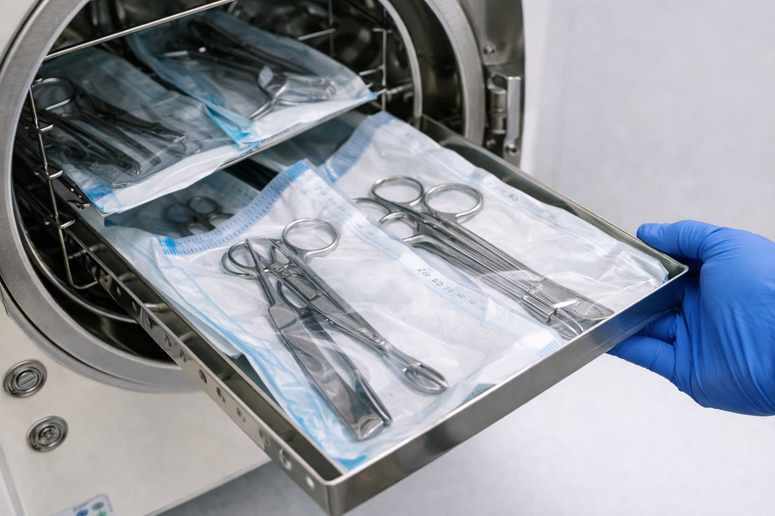 Před samotnou sterilizací je nutné nástroje správně připravit -> očistit, opláchnout, vysušit a zabalit do sterilizačních obalů.