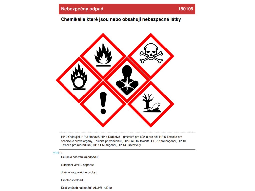 Použití: Označení pytlů, kontejnerů a nádob na chemický odpad
